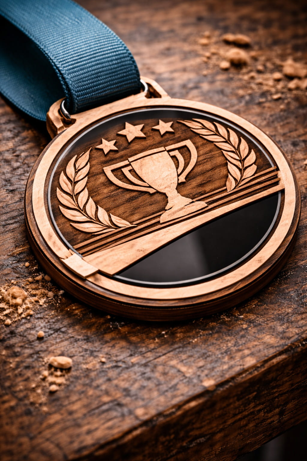 Diseñamos y fabricamos medallas personalizadas a medida, combinando madera y metacrilato mediante grabado y corte láser en nuestro taller de Asturias.