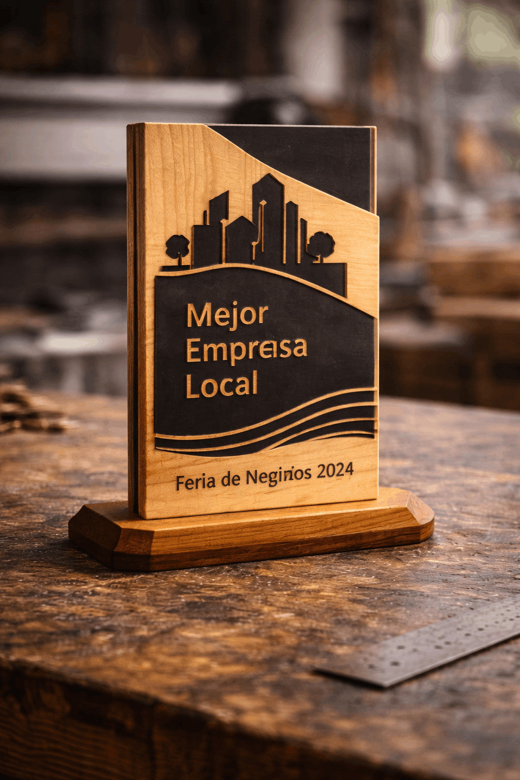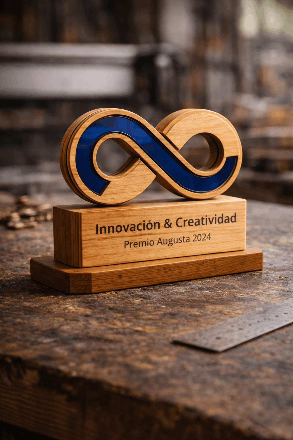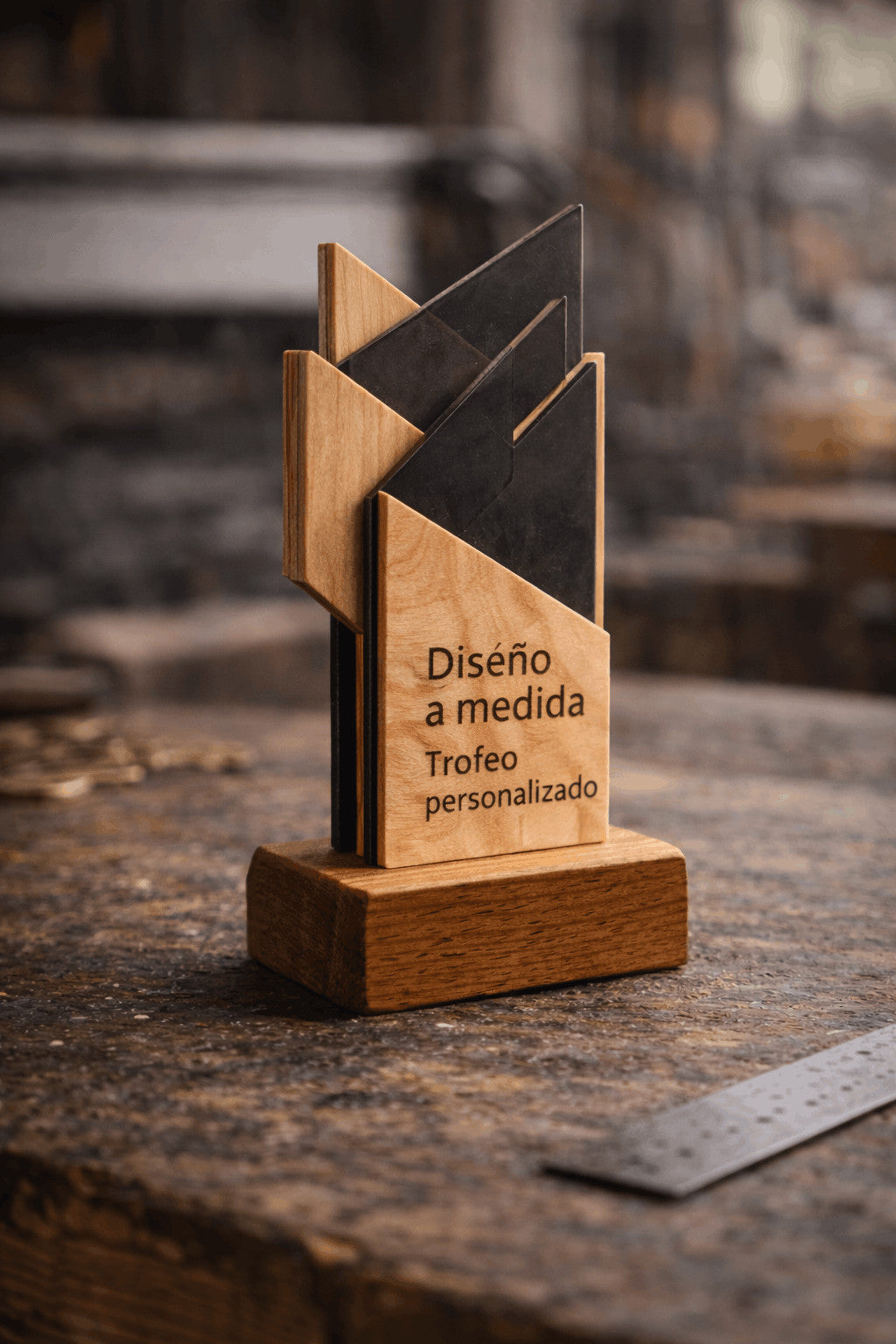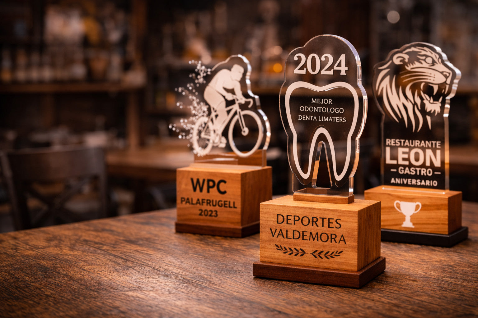 Diseñamos y fabricamos trofeos a medida combinando madera y metacrilato, utilizando grabado y corte láser en nuestro taller de Asturias.